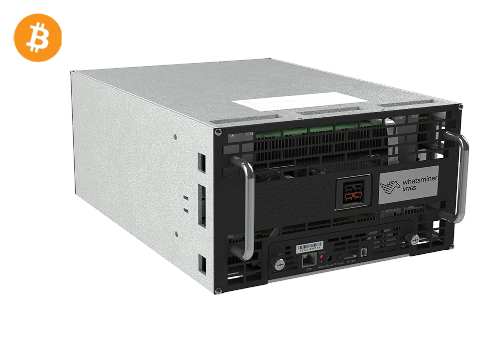 Model Whatsminer M76S from MicroBT mining SHA-256 algorithm with a maximum hashrate of 406Th/s for a power consumption of 5481W.